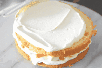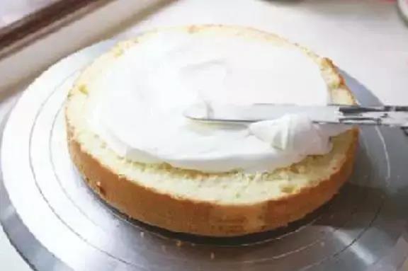 3、先從中心向外涂抹一層打發(fā)好的淡奶油,不要涂太厚,只要把蛋糕胚蓋住即可。
