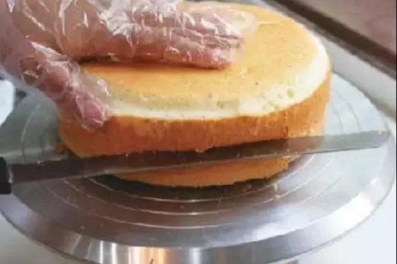 2、將鋸齒刀與轉(zhuǎn)臺面呈平行角度把蛋糕一分為二,一只手壓住蛋糕胚,另一只手前后拉鋸開蛋糕。
