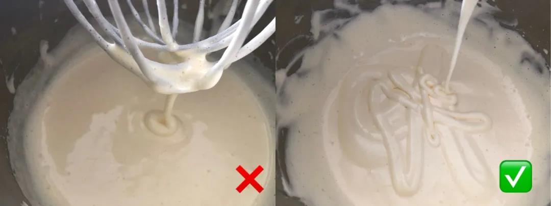 1. 標(biāo)準(zhǔn)蛋打發(fā)之后,用手指勾起,面糊會(huì)呈現(xiàn)出稀軟的尖峰,開始時(shí)向下流一兩滴,然后停留在手指上不再向下滴 2. 面粉加入蛋液時(shí)不可用力攪,更不可攪拌過久,最后油和奶加入時(shí)輕輕拌勻即可。