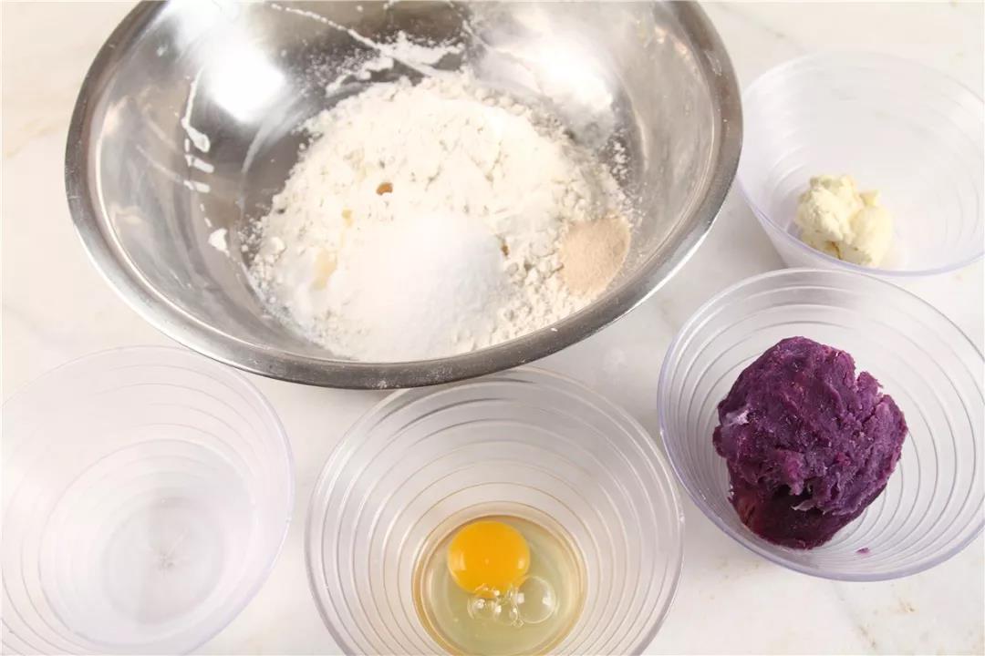 高筋面粉 250g、白砂糖45g、雞蛋25g、酵母3g、鹽4g、芝士60g、奶粉10g、熟紫薯125g、水25g