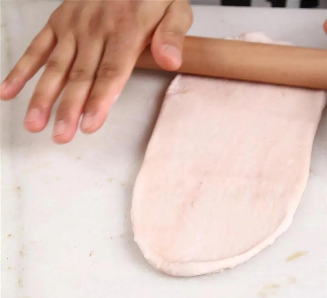 4.將松弛好的面團進行整形,用搟面杖將面團搟成長方形。