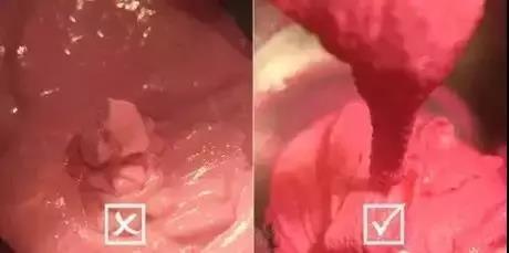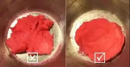 ? 攪拌面糊要適度,面糊攪拌到呈飄帶狀,提起面糊有斷落,融入面糊后,紋路10秒左右消失。
