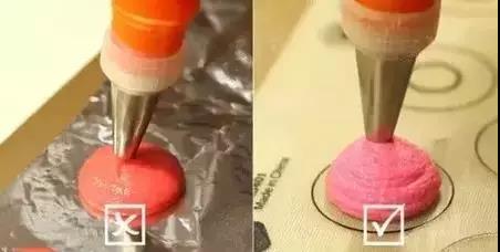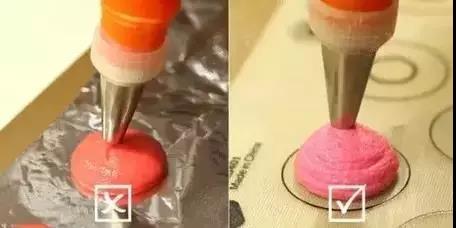 ? 最好使用專(zhuān)業(yè)制作馬卡龍的硅膠墊,導(dǎo)熱慢,防止底部過(guò)早定型,同時(shí)也能幫助統(tǒng)一馬卡龍的大小。