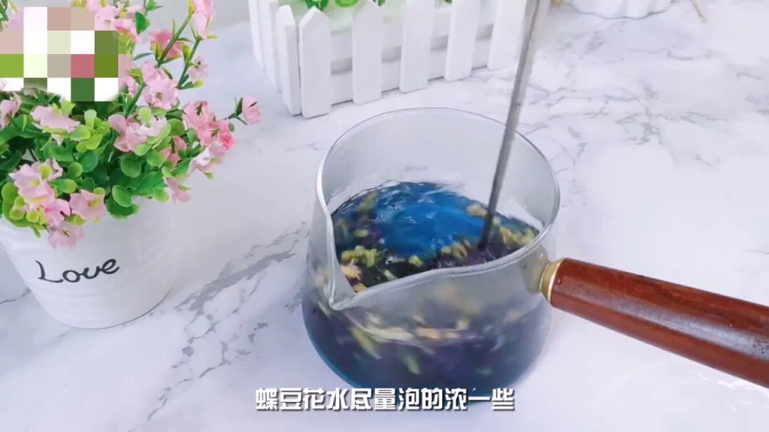1、先將蝶豆花用熱水浸泡冷藏隔夜,這樣出來的顏色會深色很多