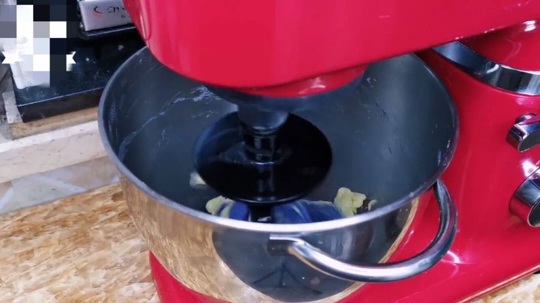 3、面團混合均勻后,把黃油放進去,用“中速”揉出手套膜即可