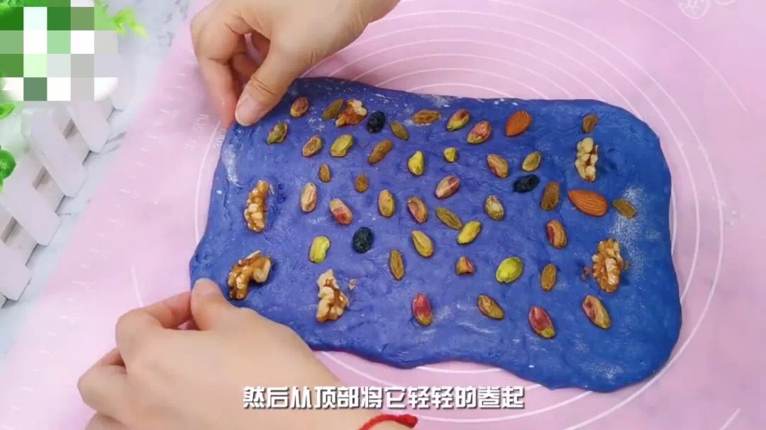 7、把蝶豆花顏色的面團,用搟面杖搟成長方形,并加入堅果果干
