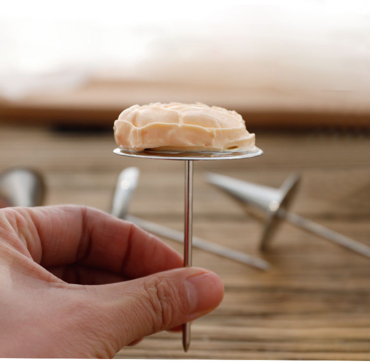 花釘是制作韓式裱花蛋糕必備的工具之一,先將花釘中間擠上奶油霜底座,再再底座上擠花,然后用剪刀、叉子將其取下放在蛋糕上。